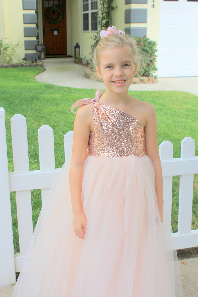 Famous tennis player Williams' daughter, Olympia, gowned out in our 182 Blush Pink One-Shoulder Tutu Flower Girl Dress. Designed with sequins and soft tutu tulle, your daughter will be your flower girl co-star!
